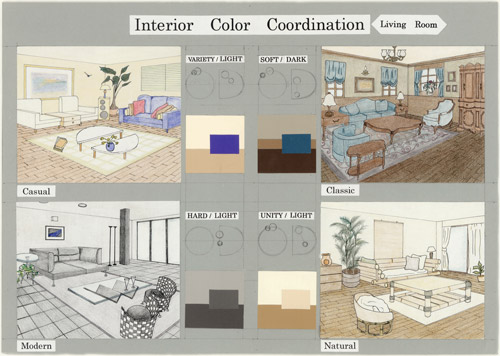 リビングルームという空間を4つのテーマ(カジュアル・クラッシック・モダン・ナチュラル)に合わせてカラーデザインする。 [技法:デッサン]